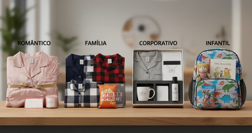 Quer acertar no presente com pijama? Este guia traz ideias práticas e assertivas por perfil de quem recebe — romântico, família, corporativo e infantil — com sugestões de kits, faixas de preço e links internos para você montar o mimo perfeito.