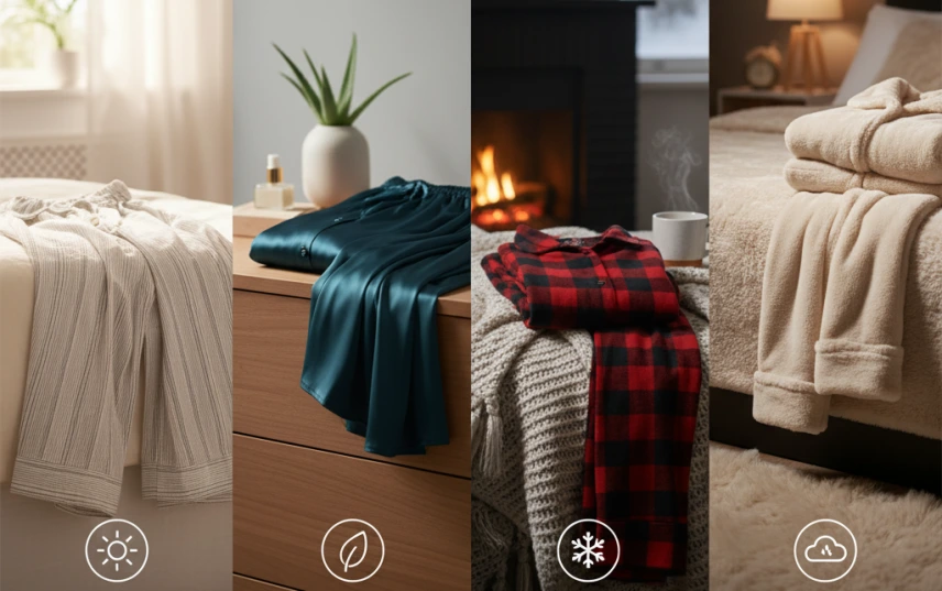 Algodão, modal, flanela e plush estão entre os tecidos mais usados em pijamas – mas cada um reage diferente ao clima e à pele. Este guia explica quando usar cada tecido, para quem ele é indicado e como cuidar para durar mais.